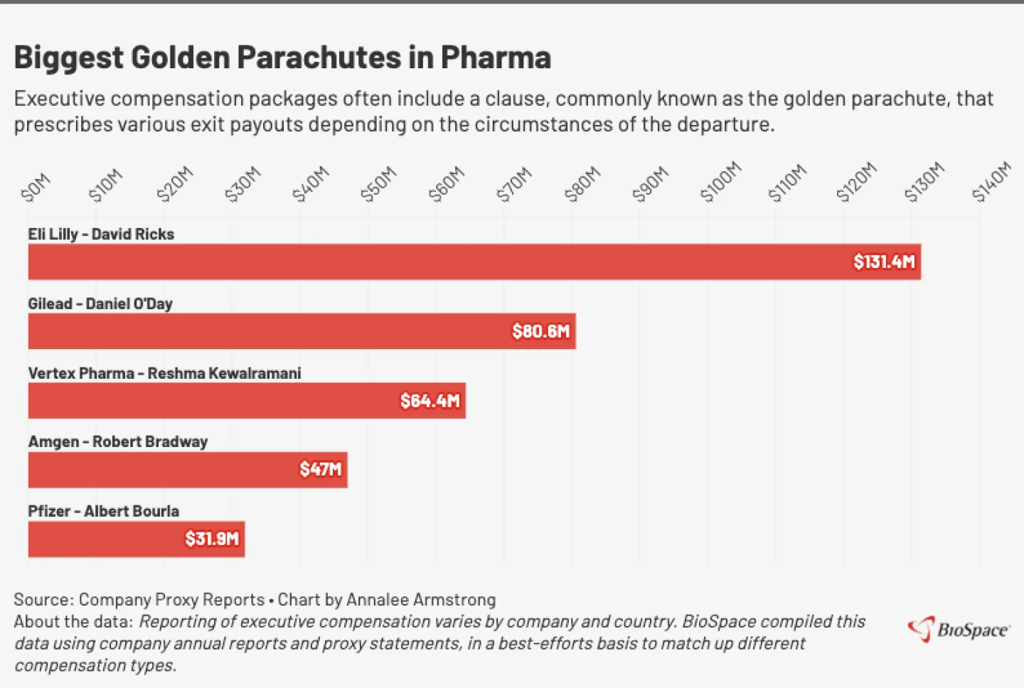 行业媒体Biospace近期深入调查了医药行业最高薪酬待遇、薪酬比例以及“金色降落伞”—— 即CEO(首席执行官)离职时所能获得的补偿金。