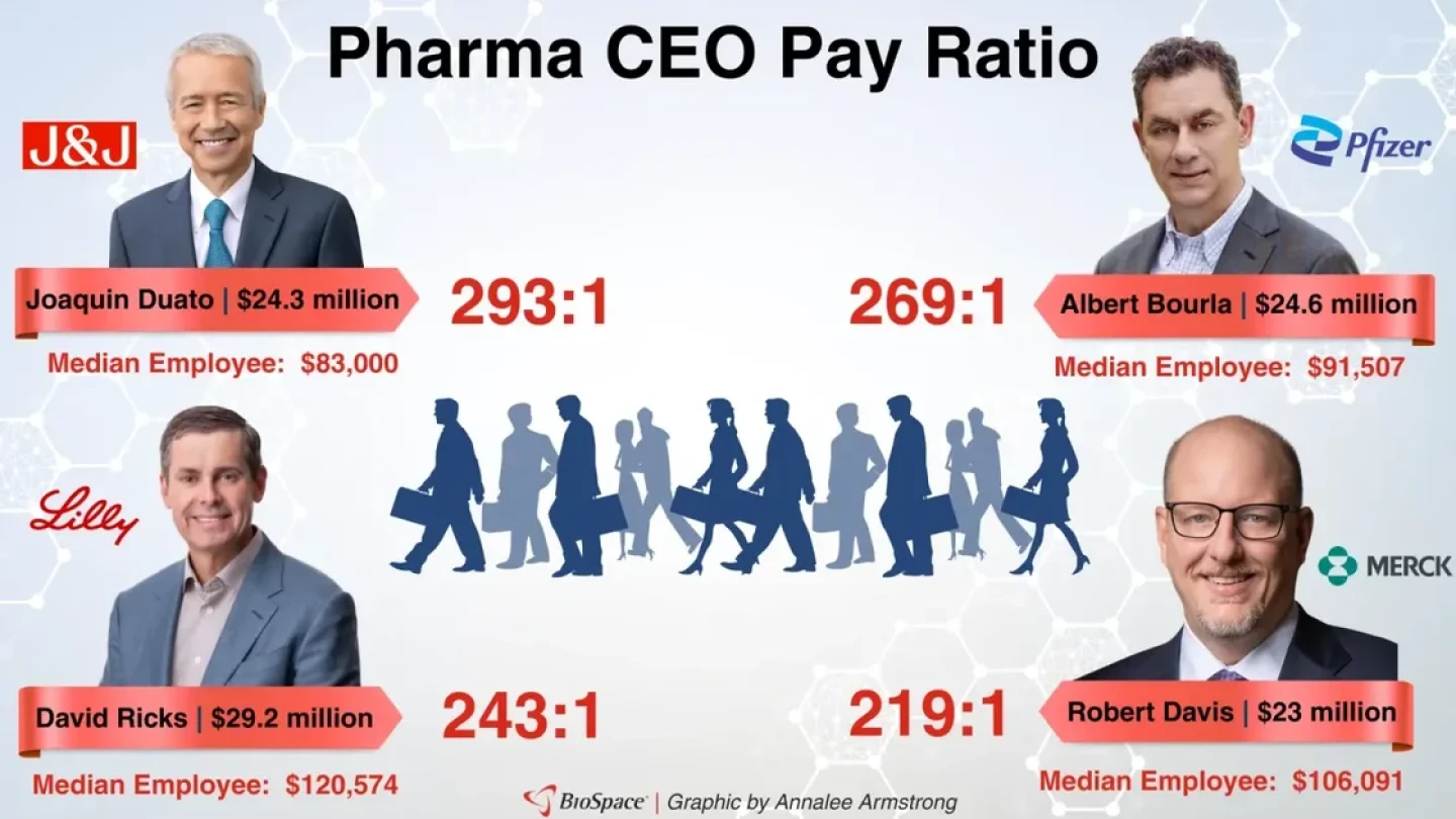 在薪酬比率榜上,超过礼来的有强生和辉瑞。强生CEO杜安卿(Joaquin Duato)的薪酬是强生员工中位薪酬(8.3 万美元)的 293 倍;辉瑞CEO艾伯乐(Albert Bourla)的薪酬是其公司员工中位薪酬的 269 倍。默克公司的戴福睿(Robert M. Davis)以 219:1 的首席执行官与员工中位薪酬比率位居第四。