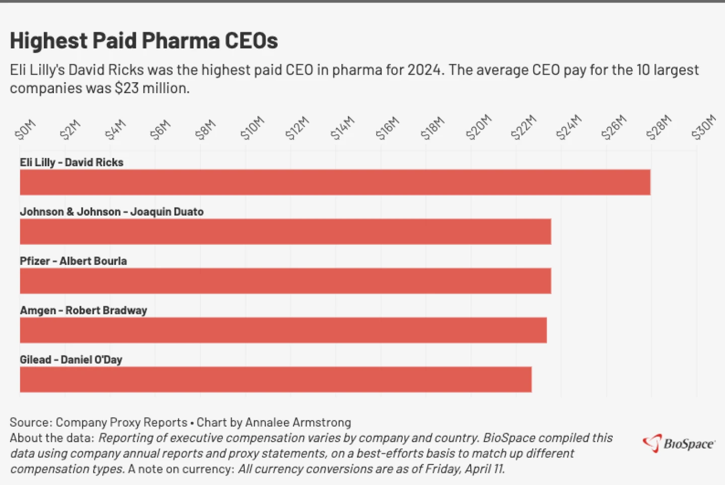 对于普通人而言,高管的薪酬套餐可能显得有些令人望而生畏。那么,我们不妨将这些制药公司 CEO 的薪酬与其他行业做个对比。根据 Equilar 100 的调查,2024 年戴文睿(David Ricks)2920 万美元的薪酬,与半导体制造商 科希伦(Coherent) 的首席执行官詹姆斯・安德森(James Anderson)相比就相形见绌了 ——詹姆斯・安德森(James Anderson)是去年薪酬最高的 CEO,收入达 1.015 亿美元。